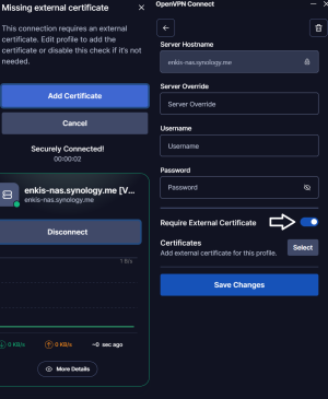 - Klicken Sie auf "Verbinden" (oder betätigen Sie den Schalter). Der Client sollte nun einen sicheren Tunnel zu Ihrem Synology NAS aufbauen. Oder er beschwert sich, dass ein externes Zertifikat fehlt...